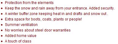 Porch enclosures portray a protected area, and are used as a buffer between the house and the elements. It can be used as a vestibule before entering the house, or as a cozy space where you may sit and watch the world pass by.